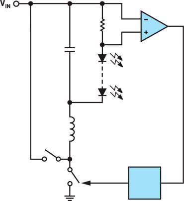 Niektóre sterowniki LED podwyższające napięcie (step-up lub boost) mogą być skonfigurowane tak, aby prąd katody LED był powrotem do zasilacza. Taka konfiguracja jest określana, jako boost-buck (rysunek 5, rysunek 6).