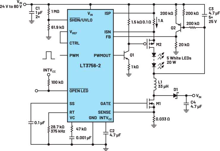 Na rysunku 1 pokazano schemat blokowy przetwornicy w topologii Buck, a przykładowa aplikacja z układem LT3932 i kluczem (tranzystorem) po stronie wysokiego napięcia w celu sterowania prądem, znajduje się na rysunku 2.
