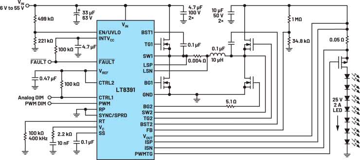 Taka topologia jest najbardziej złożona ze wszystkich zaprezentowanych w artykule (rysunek 10), ale także najbardziej elastyczna. Zakresy napięć VIN oraz VOUT są ograniczone tylko przez układ scalony kontrolera. Jest to dobry wybór do zastosowań z macierzami diod elektroluminescencyjnych.