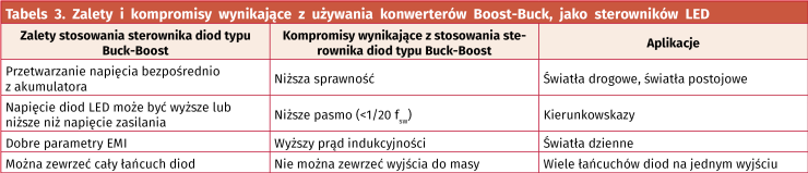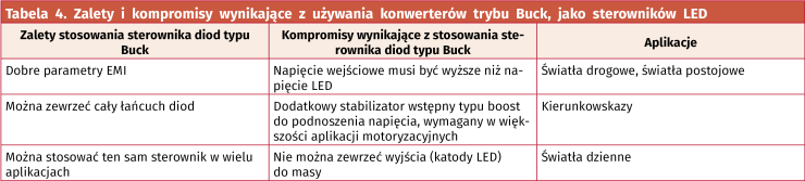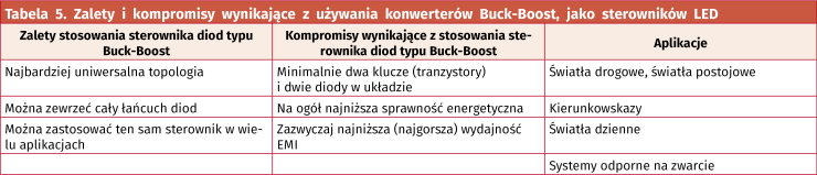 Takie rozwiązanie ma takie same ograniczenia jak buck, gdzie całkowity spadek napięcia na szeregowo połączonych LED musi być mniejszy niż napięcie zasilające na wejściu całego układu. W tabeli 4 zestawiono podstawowe cechy rozwiązania tego typu.