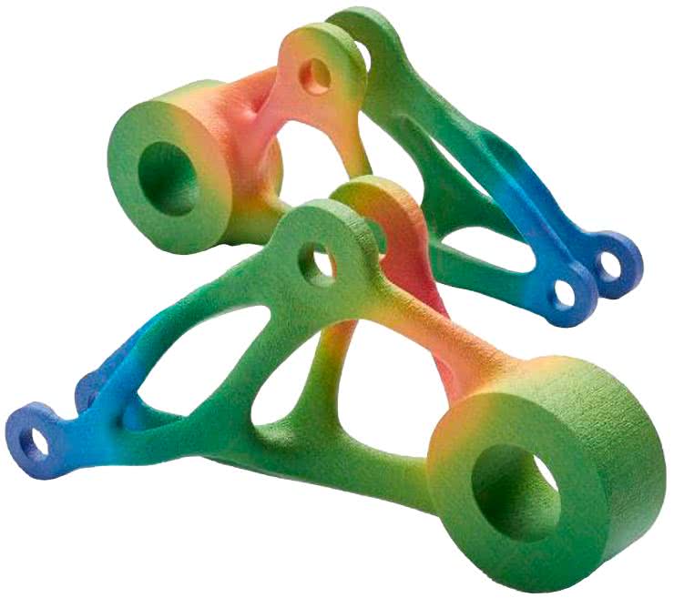 Dzięki możliwości zastosowania różnych tuszy jednocześnie w drukarkach MJF możliwy stał się druk w kolorze. Wystarczy, że jeden z tuszy zastąpi się trzema, w trzech, komplementarnych kolorach. Istotnie zwiększa to elastyczność tej technologii. Na rysunku 2 pokazano przykładowy wydruk MJF w kolorze.
