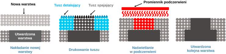 System rozpyla dwa rodzaje tuszów – spajający i tzw. detalujący. W miejscu, gdzie rozpylony został tusz spajający, podgrzane przez lampę podczerwoną drobinki, spajają się. Tusz detalujący natomiast pełni kilka ról w systemie. Od niego zależy powierzchnia drukowanego elementu. Schematycznie proces ten pokazano na rysunku 1. Tusz spajający zwiększa absorpcję materiału w podczerwieni, co powoduje, że w tym miejscu materiał pochłania więcej promieniowania z lampy podczerwonej, która naświetla warstwę po naniesieniu tuszy. Dzięki temu w tym miejscu zwiększa się temperatura, do poziomu, który pozwala na trwałe połączenie się roztopionych drobinek – w ten sposób powstaje kolejna warstwa drukowanego detalu.