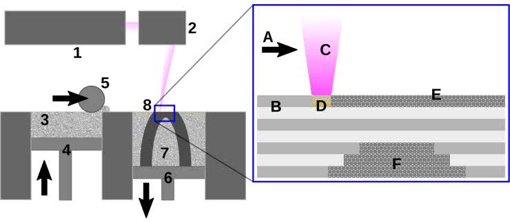 Drukowany element znajduje się na ruchomej platformie (6), która po naniesieniu i spieczeniu każdej warstwy opuszcza się o grubość naniesionej warstwy. Na przybliżeniu widoczny jest dokładniej proces spiekania: Laser (C) porusza się (w kierunku A) i naświetla proszek (E), który jest spiekany, gdy znajduje się w ognisku (D) lasera – łączy się wtedy z cząstkami dookoła siebie – po bokach jak i na dole, co zapewni spójność warstw w osi Z. Pozostały proszek (F) pozostaje w złożu i pełni rolę suportu dla warstw powyżej.