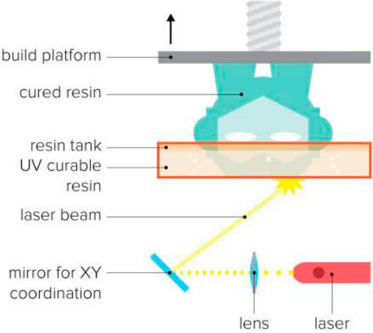 W druku SLA używa się najczęściej światła ultrafioletowego pochodzącego z lasera. Jest on skupiany na powierzchni ruchomej platformy, która zanurzona jest w wanience z ciekłą żywicą. Skupiony ultrafiolet skanuje całą powierzchnię do utwardzenia. Po spolimeryzowaniu całej warstwy detal wynurza się o wysokość warstwy, a proces powtarza się – tak długo, aż wydrukowany zostanie cały przedmiot. Po zakończeniu drukowania, obiekt jest wyjmowany z drukarki i płukany w zbiorniku z izopropanolem lub innym rozpuszczalnikiem, który usuwa nadmiar nieutwardzonej żywicy. Następnie obiekt jest finalnie utwardzany w specjalnej komorze naświetlającej UV.