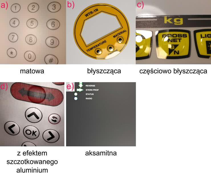 Klawiaturom foliowym, których wierzchnia warstwa tworzy elewację, nadawane są różne rodzaje powierzchni. Klient może zatem określać wygląd zamawianej klawiatury lub wybierać spośród gotowych. Możliwości jest wiele, m.in. są to powierzchnie: matowa, błyszcząca, częściowo błyszcząca, z efektem szczotkowanego aluminium, aksamitna (fotografie 6a...e). Nadruki w bogatej kolorystyce są wykonywane metodą sitodruku lub druku cyfrowego. W metodzie sitodruku farba jest nanoszona na powierzchnię folii za pomocą gumowej rakli przez drobnoziarnistą tkaninę (sito). Do powierzchni dociera tylko w tych miejscach, w których występują oczka sita. Są one wytworzone w procesie przenoszenia grafiki, która ma się znaleźć na folii. W jednym przebiegu nanoszony jest tylko jeden kolor grafiki, ważne jest zatem idealne pozycjonowanie sit dla elementów wielokolorowych. Oczka sita mogą mieć różne rozmiary, co pozwala utrzymywać dużą kontrolę nad procesem rozprowadzania farby. W efekcie uzyskuje się równomierne pokrycie drukowanych kształtów. Niestety - technologia sitodruku, używana do produkcji klawiatur membranowych, nie umożliwia zwykle uzyskiwania przejść tonalnych, które pozwalałyby np. na umieszczanie fotografii na folii, ale i tak w niczym nie umniejsza to doskonałych efektów końcowych. Możliwe jest za to stosowanie specjalnych farb, np.: odblaskowych, neonowych, metalowych, a nawet mieniących się.