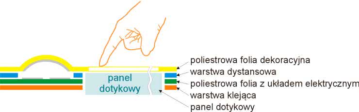 Klawiatura membranowa z panelem dotykowym. Panele dotykowe są coraz częściej stosowane do obsługi urządzeń elektronicznych. Przyzwyczaiły nas do tego w dużym stopniu smartfony czy automatyczne kasy spotykane w sklepach. Wyświetlacz z panelem dotykowym obrazuje taką samą informację jak zwykły wyświetlacz graficzny, co więcej, oba te elementy praktycznie nie różnią się budową. Nic więc nie stoi na przeszkodzie, aby zamiast zwykłego wyświetlacza graficznego umieścić w oknie klawiatury panel dotykowy. Układ warstw takiej klawiatury pozostaje bez zmian w odniesieniu do zwykłej klawiatury z oknem laminowanym (rysunek 7).