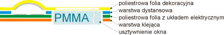 Klawiatury membranowe z laminowanym oknem. Wyświetlacze - czy to alfanumeryczne, czy graficzne, małe czy duże - są już stałym elementem większości urządzeń elektronicznych. Konstruktorzy i projektanci klawiatur foliowych musieli rozwiązać problem integracji elementów mechanicznych o bardzo zróżnicowanej budowie i wymiarach z elastyczną folią tworzącą klawiaturę. Najprostsze rozwiązanie, dopuszczalne na poziomie amatorskim i polegające na wycięciu okna w zewnętrznej warstwie klawiatury i umieszczeniu w nim na wcisk wyświetlacza, jest oczywiście niedopuszczalne na poziomie profesjonalnym. Po pierwsze, wyglądałoby bardzo nieestetycznie, po drugie zapewnienie choćby najmniejszej szczelności byłoby praktycznie niemożliwe. Problem został skutecznie rozwiązany i obecnie chyba nie ma firmy z tej branży, która nie miałaby w ofercie klawiatur z oknem. Rozwiązanie polega na zastosowaniu przezroczystej folii laminowanej, wzmacnianej szybką dystansową wykonaną z czystej optycznie PMMA (polimetakrylanu metylu, czyli powszechnie zwanej pleksi). Budowa takiej klawiatury została przedstawiona na rysunku 6. Należy zaznaczyć, że zarówno cała klawiatura, jak i okno są wycinane laserowo, co zapewnia bardzo dużą dokładność cięcia. Materiały, z których jest wykonywane okno, mają typowe grubości od 0,15 mm do 3 mm. Jeśli okno jest wykonywane nad wyświetlaczem LED, korzystne jest stosowanie kolorowych filtrów. Mogą być one nadrukowywane w oknie wyświetlacza, ale można też użyć PMMA o odpowiednio dobranej barwie. Filtry występują w różnych postaciach: jako powłoka antyrefleksyjna, powłoka twarda (hard-coated) lub matowa.