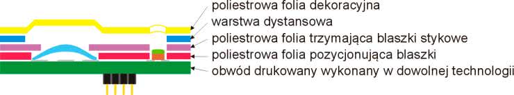 Klawiatura tłoczona z blaszkami i diodami LED SMD. Użytkownicy płaskich klawiatur foliowych często narzekają, że nie wyczuwają momentu zadziałania przycisku. Faktycznie, o ile fakt aktywacji danego styku nie jest potwierdzony jakimś sygnałem dźwiękowym lub optycznym, a także nie widać tego od razu po zachowaniu się urządzenia, nie można mieć pewności, że przycisk faktycznie został naciśnięty. Często prowadzi to do powtórnego, nawet wielokrotnego naciskania przycisku z coraz większą siłą, co może z kolei powodować uszkodzenie klawiatury. Rozwiązaniem jest zastosowanie blaszek stykowych, które dadzą wyraźnie wyczuwalny "klik" po naciśnięciu przycisku, informujący użytkownika o prawidłowym działaniu klawiatury. Konsekwencją takiego rozwiązania jest zwiększenie liczby warstw wewnętrznych klawiatury, ale dodatkową korzyścią jest możliwość umieszczenia na jednej z wewnętrznych warstw na przykład diod LED, wykonanych w technologii SMD (rysunek 3). Wadą klawiatur z blaszką jest ich nieco krótsza żywotność, zaletą natomiast - mniejsza rezystancja styków w porównaniu z klawiaturami płaskimi.
