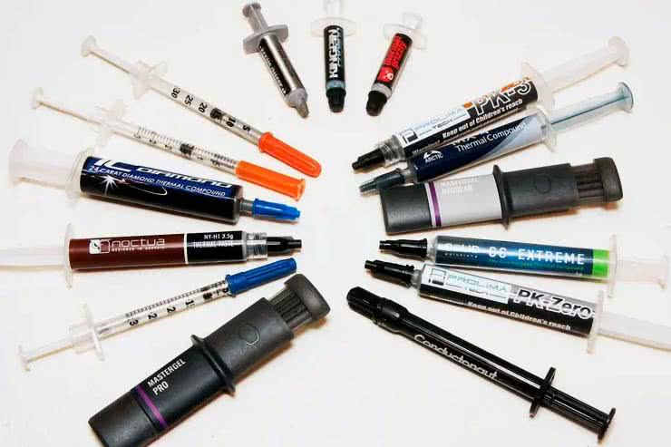 W produkcji materiałów termoprzewodzących istotne znaczenie mają bazy silikonowe, stosowane zarówno do wytwarzania past (fotografia 17), jak i klejów (fotografia 18) oraz przekładek samoprzylepnych (fotografia 19). W celu zwiększenia wydajności chłodzenia materiał bazowy jest często uzupełniany domieszkami obniżającymi wynikową rezystancję termiczną – wiele past termoprzewodzących ma w swoim składzie proszki metaliczne (srebro, miedź, złoto lub aluminium), bądź wypełniacze ceramiczne.