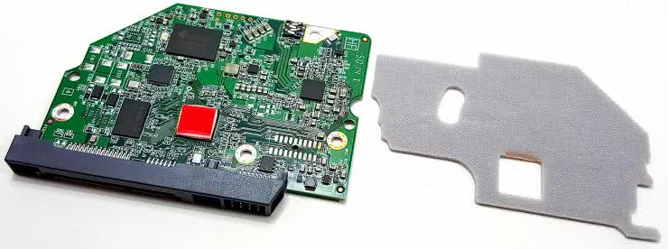 - Zastosowanie obudowy jako radiatora – metalową obudowę, nawet jeżeli swoją budową nie przypomina ona typowego, bogato użebrowanego radiatora, można z powodzeniem zastosować w roli elementu rozpraszającego ciepło do otoczenia. Dobrym przykładem mogą być obudowy dysków HDD, które – dzięki zastosowaniu przekładek termoprzewodzących – łączone są powierzchnią PCB lub obudową komponentu wymagającego chłodzenia (fotografia 14).