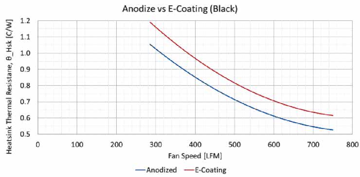 Znaczenie dla efektywności radiatora ma – oprócz geometrii – także wykończenie powierzchni. Tańsze radiatory o naturalnej, metalicznej powierzchni znacznie gorzej oddają bowiem ciepło drogą promieniowania termicznego. Zniwelowanie tego problemu może być zrealizowane na drodze anodowania bądź pokrywania specjalnymi powłokami, nanoszonymi na powierzchnię radiatora metodą określaną mianem E-Coating – drugie z wymienionych rozwiązań daje lepszy efekt estetyczny (fotografia 13), choć nieznacznie pogarsza skuteczność chłodzenia przy użyciu tak wykończonego radiatora (rysunek 16).