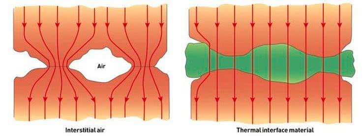 Do tej pory niejednokrotnie wspomnieliśmy już o konieczności stosowania materiałów termoprzewodzących pomiędzy powierzchnią obudowy komponentu a radiatorem. Konieczność ta wynika wprost z niedoskonałości obydwu obiektów w ujęciu mikroskopowym – pomiędzy rzeczywistymi powierzchniami znajdują się bowiem liczne, drobne wnęki powietrzne. Przekaz ciepła może zatem zachodzić praktycznie tylko w tych miejscach, w których obydwa elementy faktycznie stykają się ze sobą bezpośrednio (powietrze jest doskonałym izolatorem cieplnym, więc zaledwie niewielka część energii może być przekazywana przez wspomniane luki). Lokalne „zagęszczanie” strumienia ciepła (rysunek 17) w praktyce manifestuje się jako wzrost rezystancji termicznej całego układu. Zadaniem pasty, kleju lub podkładki termoprzewodzącej jest zatem wypełnienie drobnych nierówności obu powierzchni i wyparcie znajdującego się w nich powietrza.