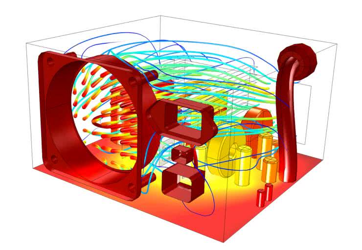 - Rozmieszczenie komponentów w obudowie urządzenia – prawidłowe podejście do projektowania sprzętu chłodzonego konwekcją (w szczególności wymuszoną) wymaga skrupulatnego przemyślenia rozmieszczenia otworów wentylacyjnych względem położenia wentylatora oraz wszystkich pozostałych bloków urządzenia. Przepływ powietrza nie może bowiem powodować nagrzewania czułych obwodów (np. analogowych) gorącym strumieniem gazu, ogrzanego przez radiatory współpracujące z zasilaczem czy też końcówką mocy. Bezcenne jest w tym przypadku doświadczenie wsparte pewną dozą inżynierskiej intuicji – w bardziej złożonych przypadkach trzeba jednak posiłkować się zaawansowanym oprogramowaniem do symulacji ruchu powietrza (rysunek 18)