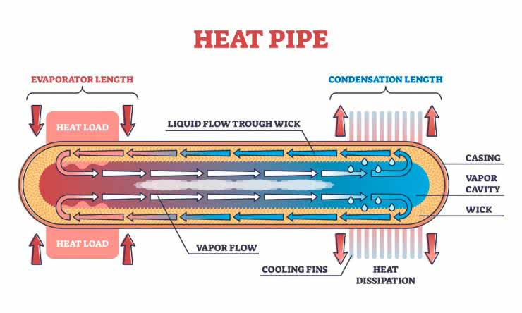 Ogrzewanie jednego końca rurki (połączonego z radiatorem zamontowanym na obudowie chłodzonego komponentu) powoduje odparowywanie cieczy, która – przemieszczając się w stronę przeciwległego, „zimnego” końca rurki – ulega schłodzeniu i skropleniu. Tam jest „przechwytywana” przez plecionkę i samoczynnie doprowadzana z powrotem do obszaru odbioru ciepła. Ten „termodynamiczny samograj” znalazł szerokie zastosowania przede wszystkim w budowie komputerów przenośnych, w których umożliwia elastyczne projektowanie ułożenia elementów komputera tak, by ciepło odebrane z procesora odprowadzić w inne miejsce obudowy i tam rozproszyć je za pomocą przewodzenia (do pokrywy) bądź za pośrednictwem konwekcji wymuszonej (przy pomocy niskoprofilowego wentylatora promieniowego – fotografia 29).