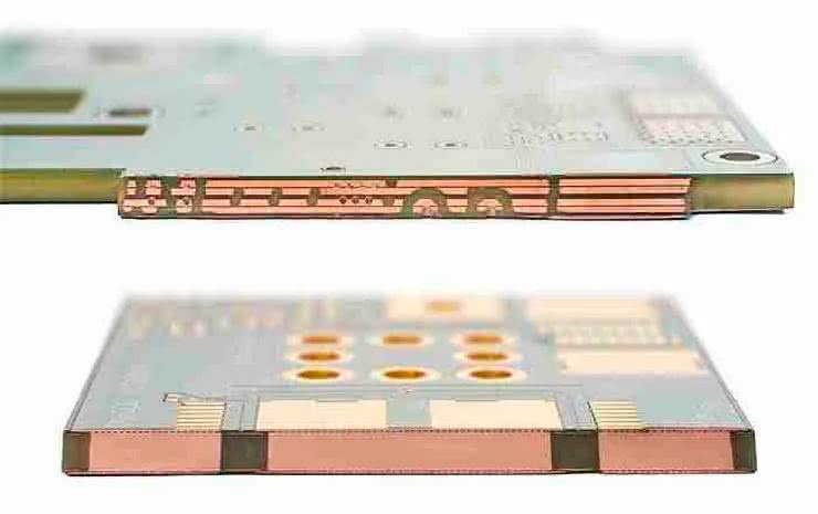 Najbardziej zaawansowani wytwórcy PCB potrafią ponadto wykonywać znacznie trudniejsze w produkcji, ale niezwykle skuteczne termicznie obwody typu heavy copper (tj. z ponadprzeciętnie grubymi warstwami miedzi – fotografia 33) oraz obwody z wbudowanymi radiatorami miedzianymi, tzw. copper coin (fotografia 34).