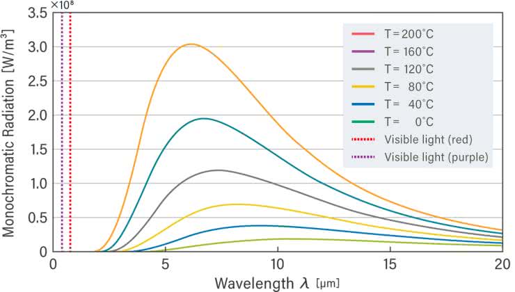 Promieniowanie termiczne to utrata energii na skutek emisji podczerwieni, głównie w jej średnim oraz bliskim (w przypadku ciał o bardzo wysokiej temperaturze) przedziale widma. Rozkład spektralny promieniowania zależy od temperatury ciała i to zarówno pod względem amplitudy, jak i położenia piku charakterystyki widmowej na osi poziomej, reprezentującej długość fali (rysunek 11).