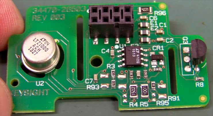 - Uwarunkowania geometryczne – w wielu przypadkach odprowadzenie umiarkowanej ilości ciepła jest możliwe przy sporym udziale naturalnego przewodzenia nadmiaru energii z nagrzewającego się komponentu do najbliższego otoczenia konstrukcyjnego. Dobrym przykładem będzie tutaj płytka drukowana, której warstwy miedzi stanowią całkiem wydajny radiator dla komponentów o niezbyt wysokich wymaganiach w zakresie chłodzenia. Należy jednak pamiętać, że w przypadku precyzyjnych układów pomiarowych takie „udzielone” ciepło, pochodzące z dalszych obszarów PCB, może zaburzać pracę wzmacniaczy, oscylatorów i innych układów relatywnie wrażliwych na temperaturę. Stąd też w najwyższej klasy urządzeniach pomiarowych można znaleźć rozmaite wycięcia w PCB (sloty), umieszczone wokół czułego źródła napięcia odniesienia – przykład pokazano na fotografii 5. Warto w tym miejscu dodać, że w kwestii efektywności chłodzenia znaczenie ma nawet umiejscowienie elementu na PCB – dobra praktyka nakazuje ustawienie nagrzewającego się komponentu możliwie jak najbliżej środka płytki, gdyż im bliżej brzegu, tym trudniej jest uzyskać odpowiednie rozproszenie ciepła w strukturach PCB (rysunek 12).