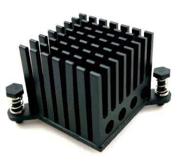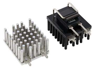 Istnieje wiele sposobów mocowania radiatorów, przy czym wybór optymalnego rozwiązania zależy przede wszystkim od rodzaju obudowy komponentu oraz wielkości radiatora. Lekkie, niskoprofilowe radiatory można z powodzeniem kleić bezpośrednio do obudów komponentów przy pomocy klejów lub samoprzylepnych podkładek termoprzewodzących. Większe modele są zwykle lutowane do płytki drukowanej przy pomocy wbudowanych pinów i łączone z obudową komponentu poprzez przykręcenie (fotografia 8) albo docisk (fotografia 9). Radiatory przeznaczone głównie do układów BGA (np. procesorów) są przeważnie mocowane specjalnymi, sprężynowymi dociskami szybkomocującymi (fotografia 10).