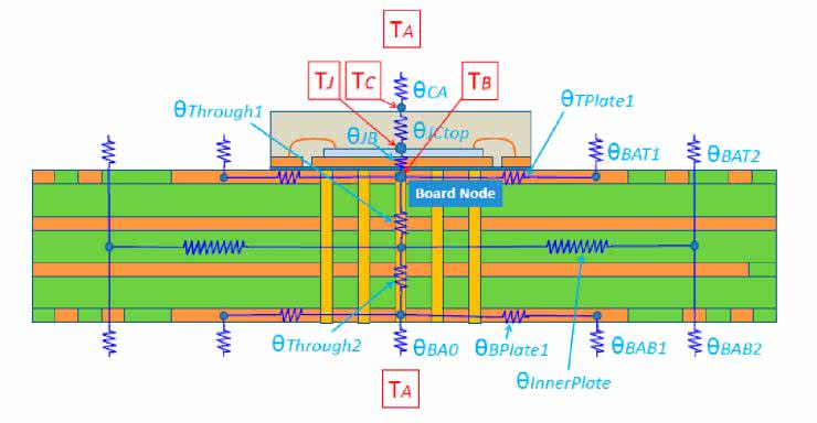 Klasyczny model komponentu wyposażonego w radiator i warstwę termoprzewodzącą zaprezentowano na rysunku 13. Ten sposób liczenia rezystancji termicznych lub temperatur (w zależności od tego, która wielkość jest niewiadomą w danym projekcie) najlepiej sprawdza się w przypadku... komponentów przewlekanych. W technologii SMT do głosu dochodzą już bowiem zupełnie inne drogi przewodzenia ciepła. Opisana powyżej metoda obliczeń termicznych dobrze nadaje się np. do oszacowania temperatury struktury stabilizatora 78xx w obudowie TO-220, przykręconej do radiatora o znanej rezystancji Rth(s–a), zaś poboczne drogi „ucieczki” ciepła (np. przez wyprowadzenia komponentu, pady lutownicze i ścieżki na PCB) można w zupełności zaniedbać, gdyż ich udział w obniżaniu temperatury będzie pomijalny. Z diametralnie innymi zagadnieniami mierzymy się natomiast rozpatrując parametry termiczne układów scalonych i komponentów dyskretnych montowanych powierzchniowo. Rolę radiatora pełnią najczęściej przede wszystkim przelotki, płaszczyzny masy i zasilania, a także ścieżki podłączone do indywidualnych padów (rysunek 14).