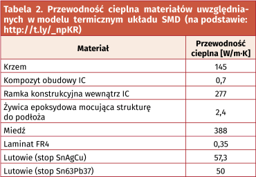 Na szczęście, w doskonale opracowanych materiałach marki onsemi znajdujemy tabelę z wartościami przewodności cieplnej dla wszystkich rozpatrywanych materiałów (tabela 2). Rzecz jasna same wartości to nie wszystko – trzeba bowiem jeszcze uwzględnić nietrywialne zależności geometryczne oraz (co chyba najważniejsze w każdym zadaniu związanym z modelowaniem matematycznym) dokonać niezbędnych uproszczeń poprzez pominięcie elementów o znaczeniu marginalnym dla wyniku obliczeń i zidentyfikowanie tych składowych rezystancji termicznej, które w praktyce okażą się najważniejsze.
