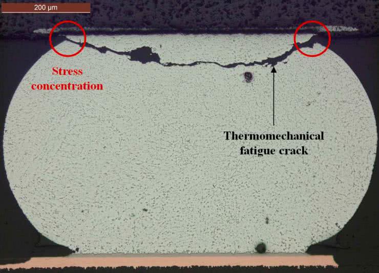 - Wpływ temperatury na niezawodność połączeń lutowanych – liczne badania materiałowe udowodniły wpływ narażeń termomechanicznych (tj. naprężeń mechanicznych „wspieranych” przez zmieniającą się w szerokim zakresie temperaturę) na powstawanie uszkodzeń połączeń lutowanych (fotografia 1). O ile bowiem temperatura otoczenia sama w sobie jest kluczowa dla niezawodności urządzeń elektronicznych, to silne, lokalne przegrzewanie układów scalonych czy też dyskretnych podzespołów półprzewodnikowych może dodatkowo zwiększać wahania temperatury, prowadząc do szybszego powstawania pęknięć w objętości lutowia.