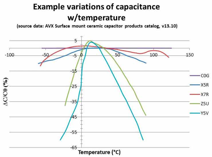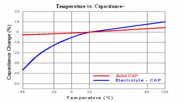 W świecie kondensatorów zróżnicowanie efektów termicznych jest jeszcze większe. Co ciekawe, w przypadku kondensatorów ceramicznych (oczywiście z wyjątkiem tych z dielektrykiem C0G, tj. o niemal zerowej wrażliwości na zmiany temperatury), charakterystyki nie są nawet monotoniczne w pełnym zakresie dopuszczalnych warunków termicznych (patrz rysunek 5). Zależność pojemności od temperatury staje się widoczna także wśród kondensatorów elektrolitycznych – znacznie stabilniejsze termicznie od klasycznych kondensatorów z elektrolitem ciekłym są elementy wykonane na bazie elektrolitu stałego (rysunek 6). Na marginesie warto też dodać, że efekty starzenia termicznego tych pierwszych należą do najważniejszych czynników wpływających na ich niezawodność, a wynika to wprost z odparowywania, czy nawet wycieków elektrolitu w warunkach podwyższonej temperatury otoczenia.