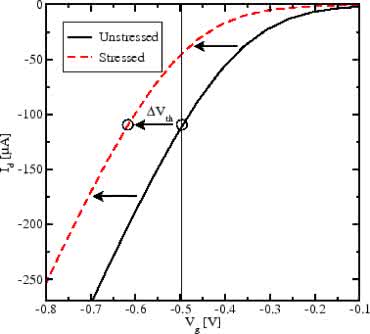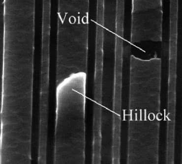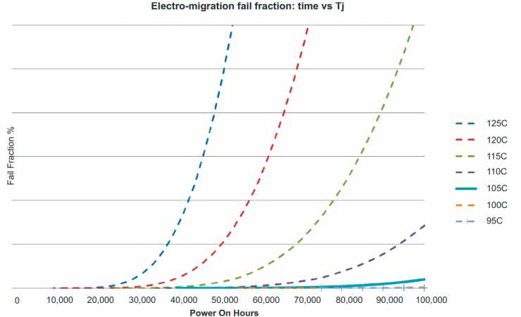 - Termiczne przyspieszanie starzenia półprzewodników – za awarie komponentów elektronicznych powstałe w wyniku ich nadmiernego nagrzewania się podczas pracy odpowiada wiele mechanizmów. Sporo zjawisk, zachodzących w samym półprzewodniku bądź w metalowych połączeniach struktur krzemowych (tzw. bonding), jest niejako „katalizowanych” przez temperaturę, a największy udział w starzeniu komponentów ma elektromigracja. Proces ten polega na przemieszczaniu atomów materiału, które są niejako „porywane” przez ruch elektronów, co prowadzi do lokalnych dysproporcji objętościowych – gdy w jednym miejscu przewodnika ubywa, w innym powstaje jego nadmiar, wynikający z akumulacji przemieszczonych atomów. W ten sposób w strukturze lub połączeniach powstają zwężenia i poszerzenia, a w skrajnych przypadkach – przerwy bądź zwarcia (fotografia 2). Co gorsza, proces ten znacząco przyspiesza zarówno wraz z lokalnym wzrostem gęstości prądu (czemu sprzyja postępująca miniaturyzacja, zwłaszcza w zakresie komponentów dużej mocy), jak i ze wzrostem temperatury pracy (rysunek 1). Podwyższona temperatura przyspiesza także wystąpienie uszkodzenia w wyniku tzw. przebicia starzeniowego dielektryka (TDDB, ang. Time-Dependent Dielectric Breakdown). Jakby tego było mało, przegrzewanie struktur komponentów półprzewodnikowych powoduje również zmiany w ich parametrach elektrycznych – przykładem może być efekt starzeniowy, określany mianem NBTI (ang. Negative Bias Temperature Instability) i polegający na stopniowym podwyższaniu napięcia progowego bramek tranzystorów MOSFET-P (a ściślej rzecz ujmując – przesuwaniu całej charakterystyki w stronę bardziej ujemnych potencjałów – patrz rysunek 2). NBTI prowadzi do zmniejszania transkonduktancji, a w efekcie do obniżenia prądu drenu tranzystora, pracującego w tych samych warunkach układowych (tj. przy określonych napięciach VGS oraz VD). Co gorsza, powyższa lista wciąż nie wyczerpuje potencjalnych konsekwencji pracy półprzewodników w podwyższonych temperaturach.