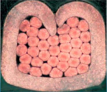 Rezystancja żyły (przewodnika) jest najczęściej podawana w Ω/km, a wynika bezpośrednio z rodzaju zastosowanego metalu (miedź, aluminium, itd.) oraz - rzecz jasna - przekroju poprzecznego żyły. W przypadku kabli miedzianych znaczenie ma także technologia obróbki metalu - miedź beztlenowa (OFC), czysta chemicznie (tj. praktycznie pozbawiona domieszek innych metali oraz tlenu) zapewnia znacznie dłuższą żywotność i odporność na korozję, ale w przypadku przewodów zasilających jest stosowana przede wszystkim przez projektantów związanych z branżą Hi-Fi audio oraz audiofili (fotografia 3).