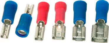 Konektory prostokątne, nazywane też płaskimi bądź - potocznie - nasuwkami (fotografia 13) są szeroko stosowane od kilkudziesięciu lat, praktycznie w niezmienionej formie. Ich zaletą jest możliwość szybkiego i łatwego łączenia oraz rozłączania obwodów bez użycia narzędzi (w przeciwieństwie do opisanych wcześniej konektorów oczkowych i widełkowych). Dobrej jakości konektory, za sprawą powtarzalnych i precyzyjnie wykonanych wywinięć blachy, zapewniają stabilne połączenie ze współpracującym stykiem, zaś dodatkowe, centralnie umieszczone wypustki w konektorach żeńskich umożliwiają blokowanie wtyku w docelowej pozycji, co utrudnia przypadkowe rozłączenie. Konektory płaskie występują w trzech najczęściej spotykanych rozmiarach: 2,8 mm, 4,8 mm oraz 6,3 mm, przy czym baczną uwagę należy zwrócić na grubość styku męskiego - wszystkie trzy wspomniane powyżej rodzaje końcówek są produkowane w wersjach o grubości 0,5 mm oraz 0,8 mm.