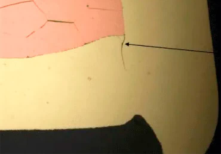 Stosowanie uszkodzonej zaciskarki (np. w wyniku wypracowania kowadełka, czyli końcówki roboczej jednej ze szczęk) może doprowadzić do powstania mikropęknięć w strukturze konektora (fotografia 23), co w aplikacjach narażonych na drgania lub naprężenia mechaniczne grozi obluzowaniem, a w skrajnym przypadku - całkowitym pęknięciem metalowej końcówki.