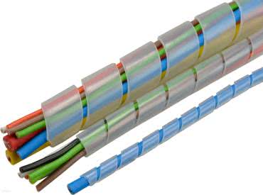 Oploty spiralne (fotografia 37) są produkowane z cienkościennej rurki z miękkiego tworzywa sztucznego, nacinanej spiralnie w celu ułatwienia w(y)prowadzania przewodów do/z jej światła. Oploty spiralne występują w dość szerokim zakresie rozmiarów i pełnią dwie funkcje: porządkową (umożliwiają wygodne prowadzenie wiązek złożonych z kilku...kilkunastu przewodów jednożyłowych lub cienkich kabli wielożyłowych) oraz ochronną (zapewniają dość skuteczną ochronę przed przypadkowym złamaniem lub przecięciem izolacji, np. w wyniku kontaktu z ostrą krawędzią obudowy). Należy przy tym pamiętać, że przewody wprowadzone do wnętrza oplotu mogą i tak zostać uszkodzone, jeżeli zaostrzona krawędź wejdzie w kontakt z izolacją okablowania w kierunku równoległym do nacięcia oplotu - z tego też względu akcesoria te należy stosować z rozwagą, gdyż nie zawsze będzie można przyjąć założenie, że oplot zapewni stuprocentową ochronę przed uszkodzeniem okablowania.