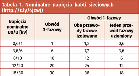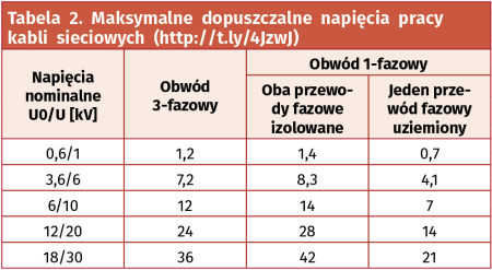 W tabeli 1 zebrano wartości nominalne sieciowych przewodów zasilających w obwodach 1- i 3-fazowych, zaś tabela 2 prezentuje wartości maksymalnych dopuszczalnych napięć pracy, odpowiadające poszczególnym poziomom U0/U z tabeli 1.