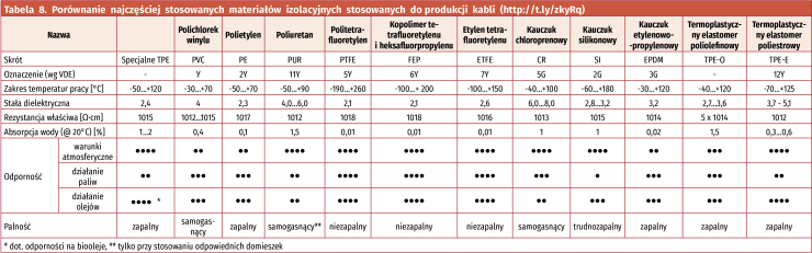 Kolejnym istotnym zagadnieniem związanym z doborem przewodów do instalacji elektrycznych jest rodzaj materiału zastosowanego przez producenta do wykonania izolacji. Podstawowy podział izolatorów wynika z ich zachowania w warunkach podwyższonej temperatury. Do polimerów termoplastycznych, czyli zmieniających po podgrzaniu swój stan skupienia do postaci płynu o wysokiej lepkości, należą m.in. polichlorek winylu (PVC, zwany także polwinitem), teflon (w odmianach PTFE, FEP czy PFA), polietylen (PE), polipropylen (PP), a także elastomery pod postacią TPE. Natomiast tworzywa termoutwardzalne to materiały, które (w wyniku obróbki termicznej) nabierają odpowiedniej twardości dzięki wytworzeniu trwałych wiązań chemicznych w strukturze polimeru. Materiały te oferują stabilne właściwości mechaniczne nawet w warunkach stosunkowo wysokich temperatur. Do omawianej grupy tworzyw należy zaliczyć m.in. polietylen chlorowany (CPE), neopren (CP), kauczuk etylenowo-propylenowy (EPR), polietylen sieciowany (XLP), polietylen chlorosulfonowany (CSPE), czy też szeroko stosowany (m.in. w przewodach pomiarowych i kablach wysokonapięciowych) silikon. Poszczególne materiały różnią się nie tylko „odpowiedzią” na wahania temperatury pracy, ale także parametrami elektrycznymi, odpornością chemiczną, palnością, czy też poziomem absorpcji wody. W tabeli 8 zebrano najważniejsze dane na temat dwunastu najczęściej spotykanych materiałów izolacyjnych.