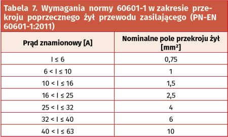 Innym przykładem może być norma 60601-1, opisująca wymagania w zakresie bezpieczeństwa podstawowego i funkcjonowania zasadniczego medycznych urządzeń elektrycznych. W tabeli 7 zebrano wymagane przekroje żył przewodu sieciowego przy obciążeniach znamionowych w zakresie do 63 A. Co ważne, norma wymusza stosowanie takiej samej grubości przewodów nie tylko w stosunku do głównego przewodu zasilającego, ale także do pozostałego oprzewodowania wewnętrznego w części sieciowej wyrobu. Warto dodać: tematyka określania obciążalności przewodów okazała się na tyle złożona, że doczekała się nawet… osobnego standardu o numerze IEC 60287-1-1:2023 CMV, traktującego tylko i wyłącznie o metodach obliczania ratingu prądowego oraz strat w przewodach(!).