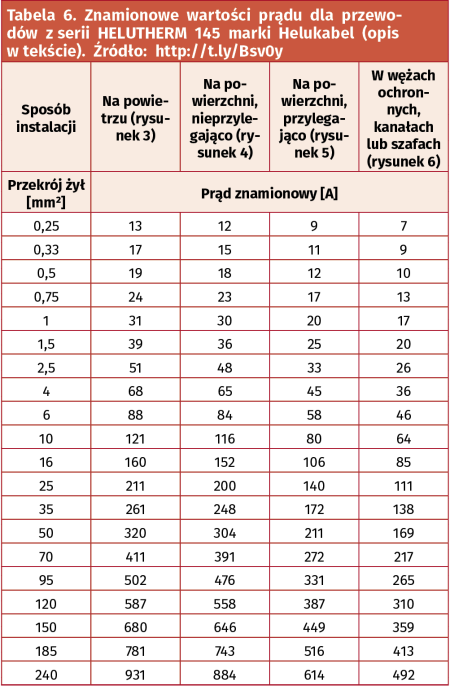 Po pierwsze, określone rodzaje przewodów różnią się konstrukcją (w tym przede wszystkim rodzajem materiału zastosowanego do produkcji izolacji), a zatem ich zachowanie pod względem termicznym będzie w pewnym stopniu różniło się od pozornie identycznego (lub bardzo zbliżonego) okablowania, ale wykonanego z innych materiałów. Jako przykład przywołajmy tutaj tabelę określającą wartości znamionowe prądu dla przewodów HELUTHERM 145 marki Helukabel (tabela 6). Jak widać, amperaż zależy nie tylko od przekroju żył, ale także od sposobu montażu przewodów, a nawet… odległości pomiędzy nimi. W praktyce należy jeszcze uwzględnić (nieujęte w tabeli 6) współczynniki korekcyjne odniesione do liczby żył zamontowanych obok siebie. A to wszystko dotyczy wyłącznie pracy tego jednego, określonego typu przewodów w warunkach otoczenia o temperaturze nieprzekraczającej 30°C i to w odpowiednio wentylowanych przestrzeniach, które nie będą podatne na akumulowanie ciepła…