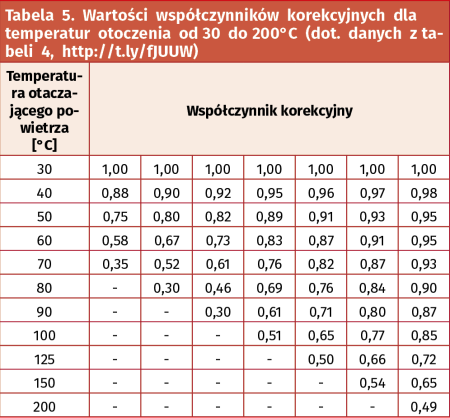 Należy bowiem wziąć pod uwagę również dopuszczalny przyrost temperatury przewodu pozostającego pod ciągłym obciążeniem (tabela 4), a także współczynniki korekcyjne dla różnych warunków otoczenia (tabela 5). Czy przytoczone tabele w zupełności „załatwiają” temat obciążalności prądowej? Zdecydowanie nie!