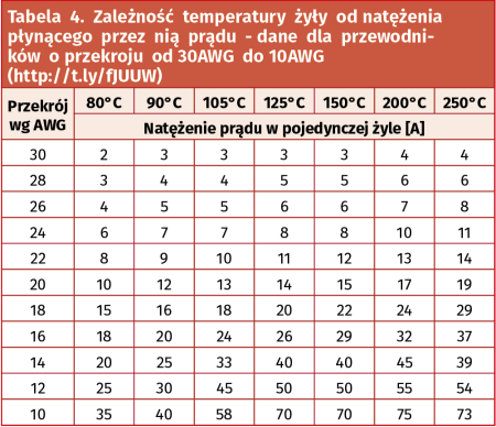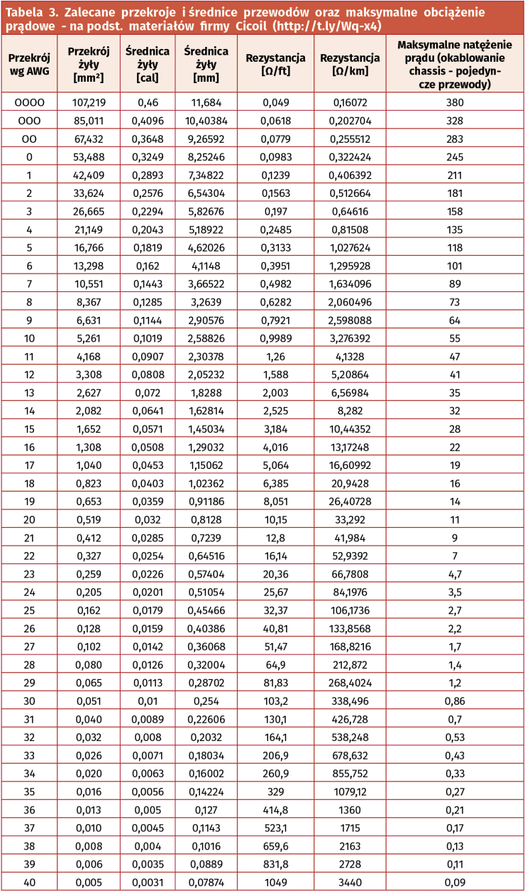 Niezwykle istotnym zagadnieniem podczas doboru okablowania do określonej aplikacji jest ustalenie minimalnego przekroju żył, pozwalającego zapewnić wymaganą obciążalność prądową. Producenci przewodów instalacyjnych i sterowniczych podają często w swoich materiałach katalogowych zalecane średnice i przekroje okablowania, które umożliwią osiągnięcie określonego amperażu danego połączenia - za przykład niech posłuży tabela 3, opracowana na podstawie informacji ze strony internetowej marki Cicoil.