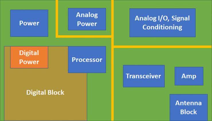 O prawidłowym (z punktu widzenia EMC) ułożeniu bloków urządzenia na obszarze PCB napisano już dziesiątki artykułów i rozdziałów w specjalistycznych monografiach. Niestety, w praktyce nad wyraz często zdarza się, że spełnienie oczekiwań teoretycznych okazałoby się niemożliwe lub nieopłacalnie trudne. Podczas codziennej pracy dość rzadko mamy możliwość całkowicie dowolnego rozłożenia podsystemów na PCB, gdyż każdy z nich współpracuje z jakimiś złączami, elementami kontrolnymi, czy nawet mechaniczną lub optyczną częścią złożonego urządzenia. O ile bowiem na dużej płytce drukowanej możemy często dość daleko odsunąć czułe układy pomiarowe od modułu radiowego lub przetwornicy DC/DC (rysunek 7), o tyle przypadku PCB przeznaczonej np. do urządzenia ubieralnego każdy blok „będzie miał blisko” do wszystkich pozostałych. I tutaj w grę wchodzi doświadczenie projektanta – to, co można, należy od siebie poodsuwać, zaś na dalszym etapie projektowania trzeba sięgnąć po inne narzędzia – optymalizację płaszczyzn masy i zasilania, filtry i obwody odsprzęgające, a nawet… techniki programowe.