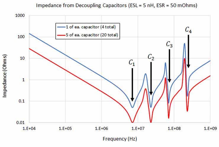 Bądźmy szczerzy – zdarza nam się lenistwo. My, elektronicy, mamy w swojej pracy bardzo często do czynienia z podobnymi lub wręcz identycznymi rozwiązaniami układowymi, powtarzanymi w ramach różnych projektów. W samym zastosowaniu sprawdzonych „w boju” rozwiązań nie ma oczywiście nic złego – co innego jednak, jeżeli bezrefleksyjnie powtarzamy je w każdej sytuacji. Dobrym przykładem będzie tutaj dobór wartości kondensatorów odsprzegających. W znakomitej większości przypadków do tego celu stosuje się pojemności 100 nF + 1...10 μF, ale przedmiotem głębszego zastanowienia bywa zwykle tylko wartość większego kondensatora, odpowiedzialnego w układzie za filtrację tętnień i zaburzeń przewodzonych w niskim paśmie częstotliwości. W szybkich układach cyfrowych i RF musimy jednak operować w pełnym spektrum używanym w danym urządzeniu – dlatego też często spotykane jest rozwiązanie, w którym łączymy równolegle całą baterię kondensatorów, np. 3 lub 4 elementy o pojemnościach różniących się pomiędzy sobą kolejno o rząd wielkości. Takie rozwiązanie pozwala znacząco obniżyć impedancję i efektywniej stłumić także zaburzenia o najwyższej częstotliwości (w tym harmoniczne wyższych rzędów).