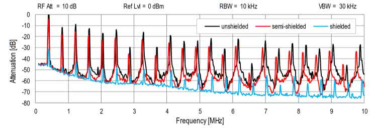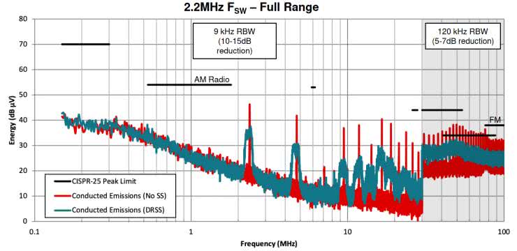 Skoro jesteśmy już przy tematyce konwerterów DC/DC, to warto podać ciekawy przykład, związany z doborem właściwego rodzaju kontrolera pozwalającego na obniżenie poziomu zakłóceń emitowanych przez układ zasilania. Klasyczne przetwornice impulsowe pracują zwykle na jednej, ustalonej fabrycznie (lub regulowanej przez użytkownika) częstotliwości. Takie rozwiązanie jest relatywnie proste konstrukcyjnie, ale ma dość istotną wadę: całość energii emitowanej w postaci zaburzeń RFI skupia się w wąskich pikach widma, odpowiadających częstotliwości podstawowej oraz szeregowi jej kolejnych harmonicznych. Zastosowanie techniki widma rozproszonego (ang. spread spectrum), polegającej na losowym lub okresowym odstrajaniu częstotliwości kluczowania w niewielkim zakresie, powoduje „rozlanie” pików do postaci szerszych pasm o niższej wartości szczytowej (rysunek 3). W ten sposób konstruktor może „uciec” nawet o kilkanaście decybeli od limitów emisji określonych normą, co w wielu sytuacjach okaże się zbawienne dla wyniku badań laboratoryjnych.