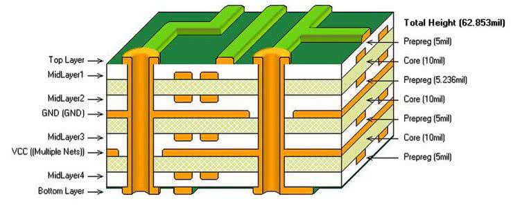 Kolejnym ważnym założeniem projektowym, które ma ogromny wpływ na optymalizację osiągów urządzenia w zakresie EMC, jest wybór optymalnego stosu wielowarstwowej płytki drukowanej. Warto w tym przypadku posiłkować się dokumentacją udostępnianą przez wybraną fabrykę – przyjęcie nierealistycznych lub nieekonomicznych założeń drastycznie zwiększy koszty produkcji, zaś podążanie ścieżką standardową (tj. zastosowanie jednego ze typowych stosów) pozwoli zachować relatywnie niski koszt i skrócić czas produkcji. Powszechnie wiadomo, że obwody wielowarstwowe dają projektantom znacznie większe możliwości m.in. w zakresie ekranowania krytycznych ścieżek w celu redukcji zakłóceń emitowanych i odbieranych z otoczenia. Równie ważne, a nawet jeszcze ważniejsze od grubości i ułożenia poszczególnych warstw dielektryka oraz miedzi (rysunek 5), będzie właściwe użycie dostępnych płaszczyzn. Kolejność ułożenia płaszczyzn masy i zasilania oraz warstw sygnałowych determinuje bowiem nie tylko ścieżki prądów powrotnych i pojemności międzypłaszczyznowe, ale także… istotnie zmienia warunki kontroli impedancji.