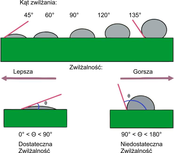 Zwilżalność danego materiału to zdolność stopu lutowniczego do rozprzestrzeniania się na jego powierzchni. Jest to kluczowy parametr w procesie lutowania, ponieważ dobra zwilżalność (kąt zwilżania poniżej 90°) zapewnia trwałe i przewodzące połączenie między elementami. Zwilżalność zależy od właściwości powierzchni materiału (np. czystości, chropowatości, składu chemicznego) oraz od właściwości samego stopu lutowniczego i zastosowanego topnika. Schematycznie zwilżalność oraz kąt zwilżania pokazano na rysunku 1.