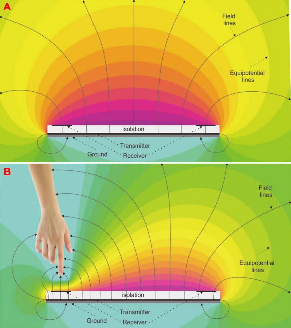 Rozwinięcie znanych wcześniej sposobów detekcji dotyku – głównie w kierunku dalszego zwiększania czułości, ulepszania metod redukcji zakłóceń i artefaktów oraz odpowiedniego przetwarzania danych płynących z przetworników pojemności – doprowadziło do opracowania rozwiązań umożliwiających bezdotykowe sterowanie urządzeniami elektronicznymi. Rozwiązania te opierają się na detekcji zaburzeń pola elektrycznego, które generowane jest w sposób zbliżony do tego, który zaprezentowaliśmy przy okazji opisu powierzchniowych paneli dotykowych (rysunki 11a i 11b).
