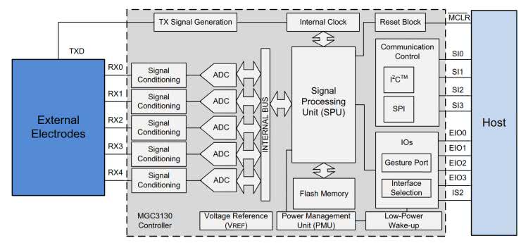 Firma Microchip wprowadziła do swojej oferty zaawansowane, wielokanałowe układy do rozpoznawania gestów, bazujące na autorskiej technologii GestIC. W zależności od rodzaju implementacji i warunków eksploatacyjnych, zasięg detekcji rozciąga się od kilkunastu do nawet 200 mm, czyli… dogania pod tym względem rozwiązania oparte na czujnikach optoelektronicznych. Co ważne – wciąż bez konieczności wykonywania jakichkolwiek dodatkowych otworów i okien optycznych w obudowie. Przykładowo – czułość układu MGC3130 (rysunek 12) dochodzi do 1 fF, szybkość odczytów – do 200 pozycji/sekundę, zaś rozdzielczość przestrzenna – aż do zawrotnej wartości 150 dpi (!).