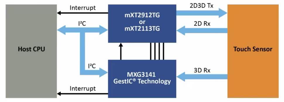 A to wciąż nie wszystko – układ MXG3141 powstał z myślą o rozbudowie istniejących systemów, opartych na ekranach pojemnościowych, o funkcję rozpoznawania trójwymiarowych gestów. Elektrody touchpanelu są współdzielone przez dwa układy: wspomniany MXG3141 oraz właściwy kontroler dotyku 2D (rysunek 13).