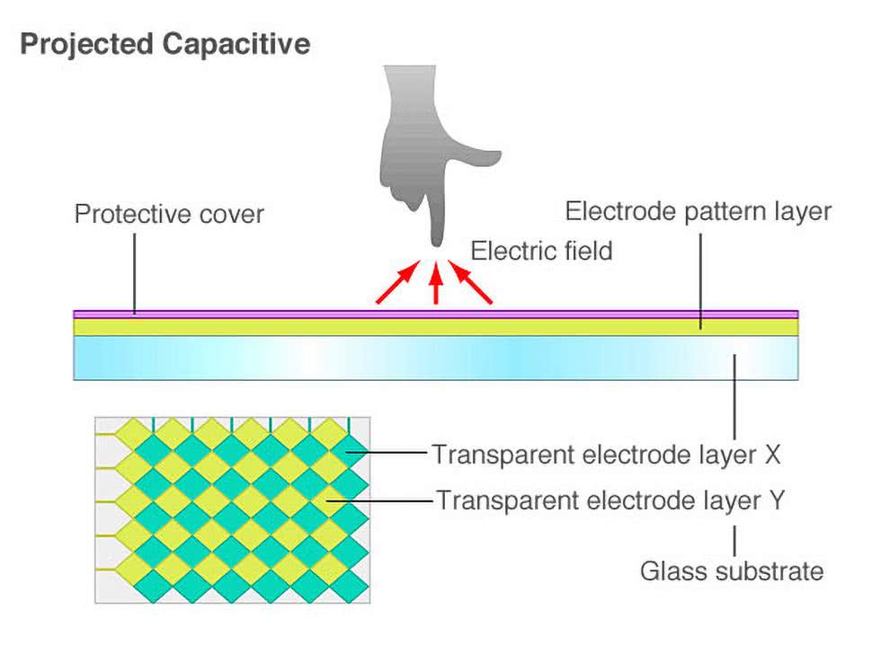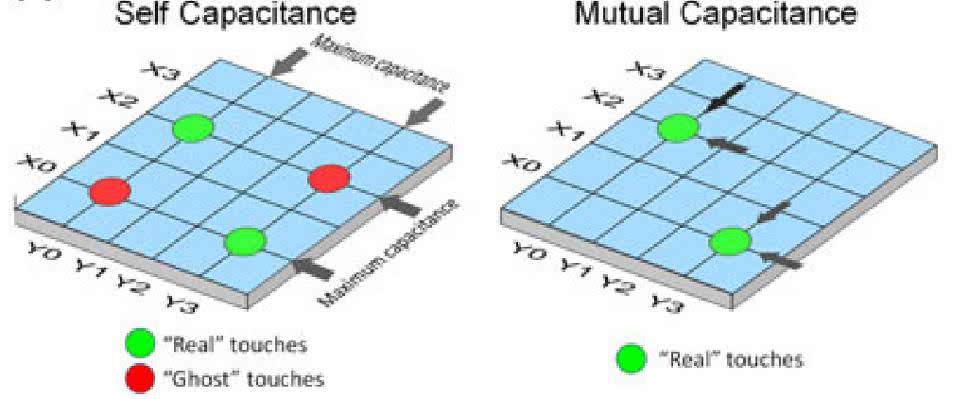 Gwoli ścisłości należy dodać, że istnieją dwie główne odmiany techniki projekcyjnej. Pierwsza z nich opiera się na pomiarze pojemności własnej danej elektrody, czyli – innymi słowy – odczyt jest dokonywany w odniesieniu do masy urządzenia. Przyłożenie palca do ekranu w danym miejscu zwiększa widzianą przez kontroler dotyku pojemność, zatem położenie punktu kontaktowego jest wyznaczane na drodze poszukiwania maksimum pojemności (a ściślej rzecz ujmując: największej zmiany względem pojemności bazowej).
