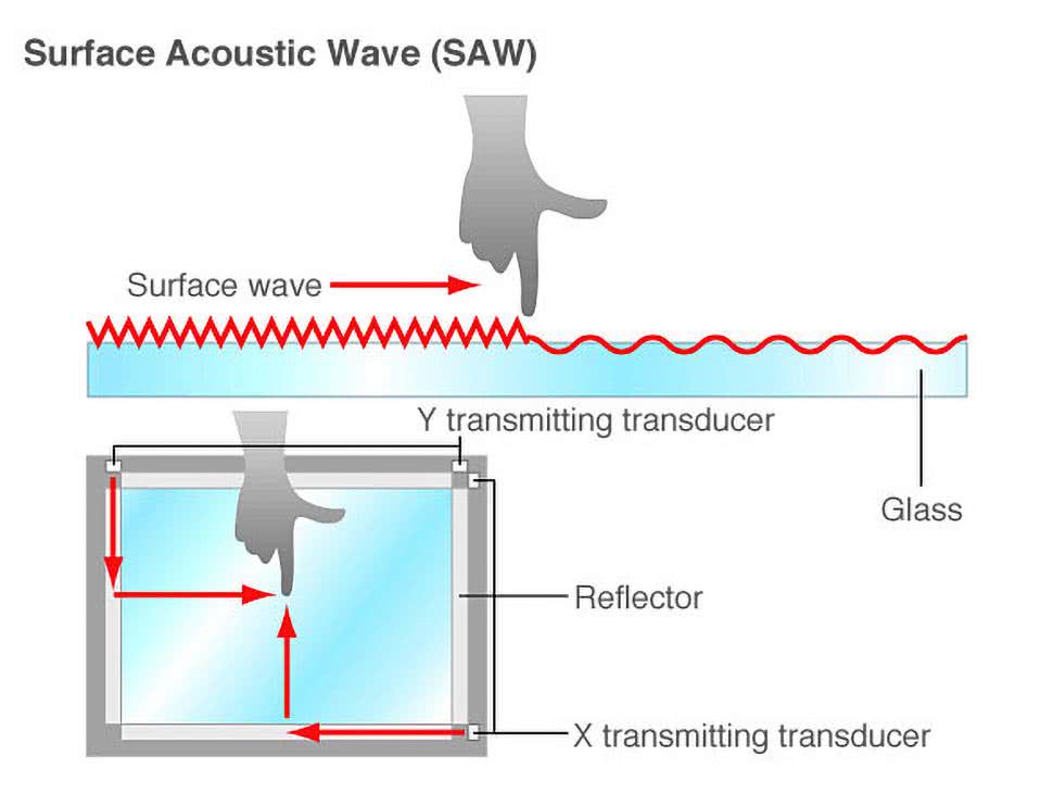 Panele dotykowe można budować także w oparciu o powierzchniową falę akustyczną (ang. Surface Acoustic Wave, SAW), tzw. falę Rayleigha – propagującą praktycznie tylko na powierzchni oraz na niewielkim obszarze w głąb materiału. W praktyce stosowane są fale ultradźwiękowe o częstotliwości rzędu 5 MHz – stosunkowo łatwe do wygenerowania i odebrania za pomocą przetworników piezoelektrycznych. Na krawędziach ekranu montowane są podłużne reflektory akustyczne, zaś w narożnikach – dwie pary przetworników (po jednym nadawczym i odbiorczym, osobno dla osi X oraz Y – patrz rysunek 9).