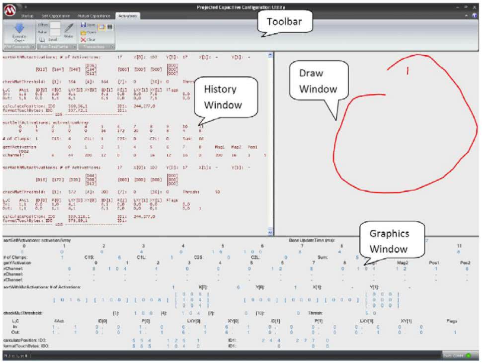 Ten sam producent przygotował także zestaw o numerze DM160211, przeznaczony do eksperymentów z kontrolerem dotyku opartym na mikrokontrolerze PIC16F707 i pozwalający nie tylko na efektowne rysowanie dowolnych kształtów w czasie rzeczywistym (w specjalnie przygotowanej aplikacji demonstracyjnej), ale także na odczyt i wizualizację (w różnych trybach) parametrów odczytywanych z procesora znajdującego się na płytce (rysunek 8).