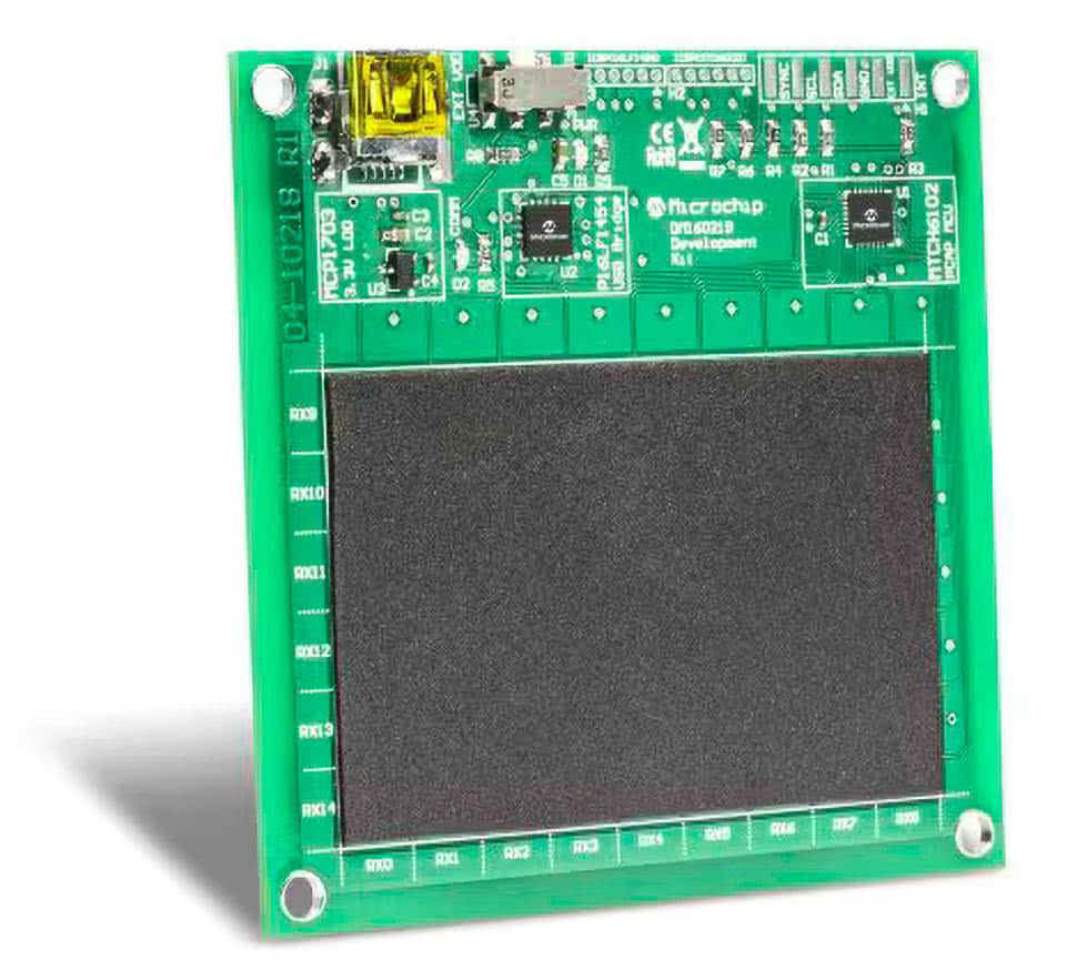 Warto w tym miejscu dodać, że technologia projekcyjna jest stosowana z powodzeniem nie tylko w budowie paneli dotykowych współpracujących z ekranami graficznymi. Z równym powodzeniem można ją również zastosować do budowy touchpadów – w tej realizacji jest ona zresztą diametralnie prostsza, cały układ może bowiem bazować na odpowiednio zaprojektowanej płytce drukowanej. Doskonałym przykładem takiej implementacji jest zestaw ewaluacyjny marki Microchip o nazwie DM160219 (fotografia 5).