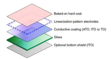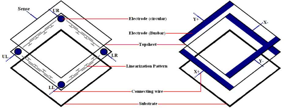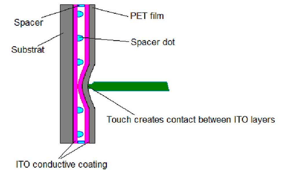 Technologia rezystancyjna opiera się na pomiarze zmian oporności pomiędzy elektrodami, połączonymi galwanicznie z dwiema warstwami przewodzącymi. Te ostatnie są przezroczyste (wykonane z tlenku indu i cyny, ITO) i umieszczone w niewielkiej odległości od siebie, pozostają „domyślnie” rozdzielone przez warstwę elementów dystansowych w postaci niewidocznych gołym okiem „kropek”. Naciśnięcie warstwy elastycznej powoduje jej ugięcie i zwarcie z powłoką ITO umieszczoną na sztywnym podłożu panelu (rysunek 1).